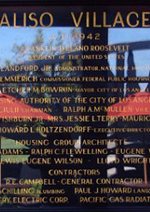 Je pense que c’est un vestige de l’ancien ensemble de logements. Pour nous donner un ancrage historique, ils ont gardé ça. Vous savez, 1942 c’est l’âge de ce site. Je n’ai jamais vu ce que c’était avant. Mais il paraît que le contraste entre l’avant et l’après est frappant, comme la nuit et le jour. Les flics ne voulaient même pas passer, tellement c’était dangereux ! La plaque, c’est la seule chose qu’ils ont conservée. [...] De ce que je comprends, il y a eu pas mal de discussions à propos du nom du centre. Vous remarquez qu’à l’extérieur, c’est seulement écrit "Community Service Centre". Il ne disent pas "Pueblo del Sol Community Service Center", même si le centre dessert principalement ce quartier. Il y a une résidente du coin qui, à ce jour, continue de mener une campagne pour que le centre porte le nom de l’ancien ensemble, qui était Aliso Village. Et cela, dans le but d’observer le sens de l’histoire et honorer tout ce qui était ici avant. Huit ans plus tard, elle est encore très active, mais pour l’instant elle n’a pas réussi à faire changer le centre de nom. Mais encore une fois, il y a ce sentiment qu’il faut essayer de maintenir un sens du passé. Elle a vécu ici toute sa vie. Et pour nous qui sommes venus ici (je suis venue ici il y a seulement deux ans), mais les gens veulent être sûrs qu’on se souvient. L’ensemble a obtenu un nouveau nom de marque, même les rues ont été renommées, je veux dire, ils voulaient vraiment un nouveau départ, de sorte que certaines habitants voulaient au moins que le centre aie un lien avec ce qui était ici avant. Ils ont construit tout à partir de zéro. Je veux dire de nouveaux noms, de nouvelles rues, il n’y avait rien qui parle de ce qui était ici avant. Mais, nous avons la plaque ! [Elle rit] C’est tout ...