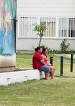 Les deux femmes assises sur le muret blanc bavardent. Je me ballade avec Ricardo dans Estrada Courts : 400 unités de logements construites par l’Etat au début des années quarante tout au sud de Boyle Heights. Au moment de la prise de vue apparaît une troisième amie. Les femmes regardent l’amie, mais l’amie regarde l’appareil. Ricardo m’explique qu’elle ne sait pas si elle peut faire partie de l’image et les femmes l’encouragent à venir les rejoindre. Il y a renversement de situation. D’abord, je veux documenter cette occupation informelle et temporaire d’un espace ouvert, en apparence public (je reviendrai sur l’utilisation du mot dans ce contexte), mais je ne veux pas m’immiscer dans l’intimité des deux femmes, c’est pourquoi je leur demande l’autorisation. Ces dernières acceptent et ce qui rentre dans le cadre de l’image devient à ce moment un autre espace temporairement privé que paradoxalement les autres résidents ne se sentent pas en droit de pénétrer. Ricardo me raconte que les soirs où les parents se retrouvent pour faire une partie de foot, les bouteilles de bière sont soigneusement alignées sur ces mêmes murets blancs. Les enfants jouent au foot sur les pelouses qui ne sont pas encerclées de murets et les parents jouent à côté, sur de plus petites pelouses mais qui ont des murets. Il me dit aussi qu’en fin d’après-midi l’espace entre les immeubles devient très animé par le jeu, les barbecues et les femmes qui s’arrêtent pour bavarder.